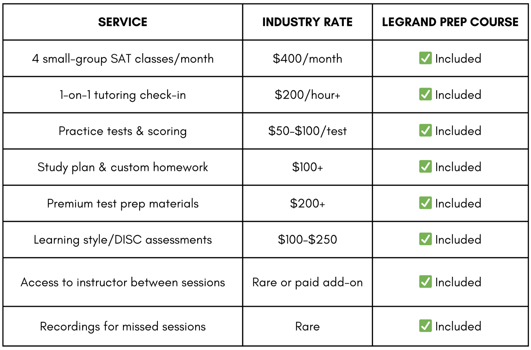 1400+ SAT results. Small group setting. Personalized attention. None of the private tutor price tag.